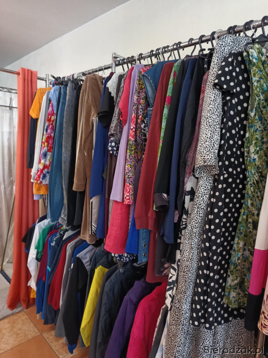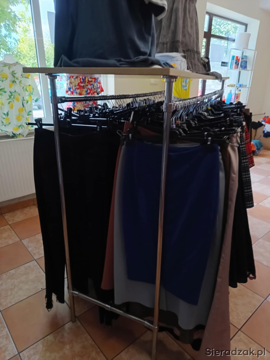 Dwa dwustronne stojące wieszaki z deską u góry, wieszak mocowany do ściany długość 5m+ 1,5m przymierzalnia, wieszak obrotowy wolnostojący, dorzucam metalową kasę i kilka rzeczy pozostałych po sklepie przydatnych na start. posiada też spor ilości wieszaków plastikowych obrotowych. Istnieje możliwość wystawienia rachunku