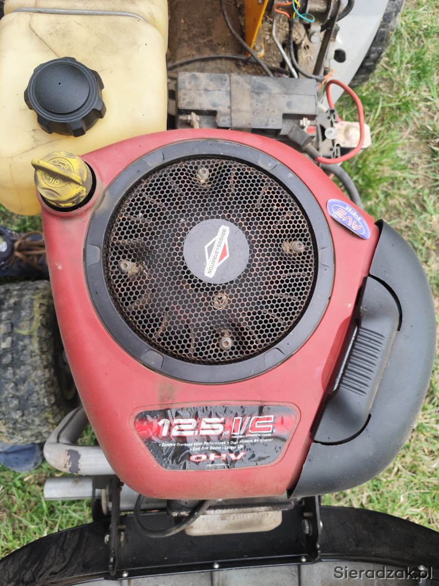 Sercem maszyny jest niezawodny, markowy silnik Briggs & Stratton 12.5 HP I/C, który działa bez zarzutu. Traktorek odpala, jeździ, układ kierowniczy sprawny.