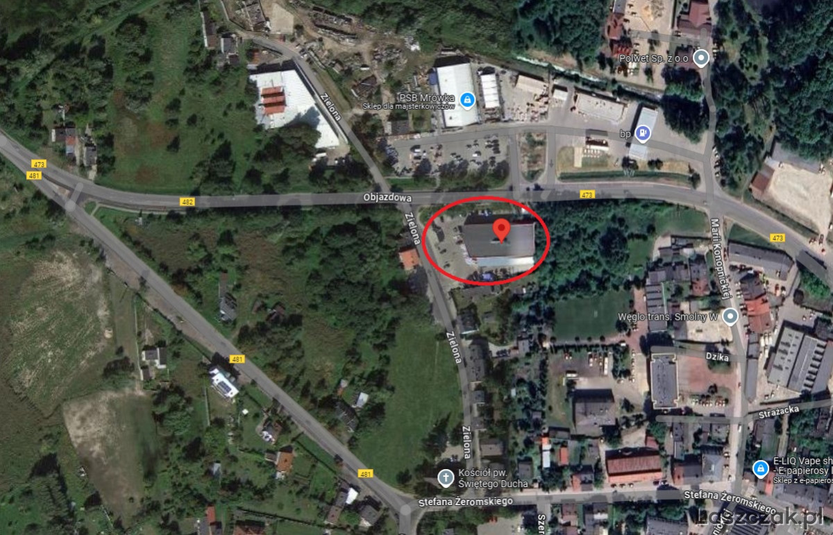 Powierzchnia lokalu wynosi ok. 540 m2. W sąsiednim lokalu działalność prowadzi sklep meblowy i AGD. Dostępność komunikacyjna do nieruchomości bardzo dobra - budynek zlokalizowany na skrzyżowaniu ulicy Zielonej z Objazdową, stanowiącą drogę wojewódzką 473.