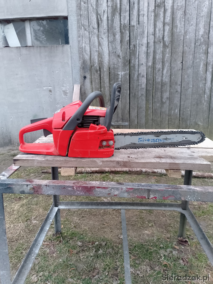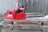 Piła odpala bez problemu zarówno na zimno, jak i na ciepło. Pracuje równo, ma dobrą moc i świetnie sprawdza się przy cięciu drewna, przygotowaniu opału czy pracach wokół domu . Maszyna używana sporadycznie przy pracach domowych. W zestawie łańcuch , prowadnica i osłona na prowadnice