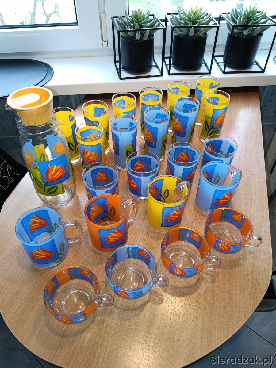 Zestaw koktajlowy składający sie z karafki 6 szklanek długich, 9 szklanek srednich 4 kubki, 4 filiżanki.