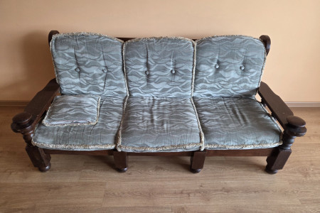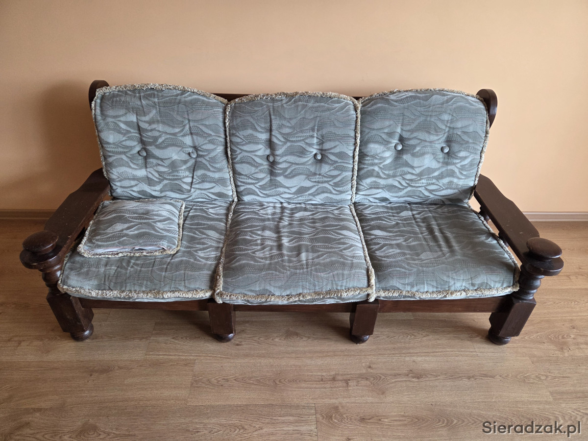 Solidna, drewniana 3-osobowa sofa w dobrym stanie. Posiada wygodne, pikowane siedziska w kolorze szarym, które nadają jej elegancki wygląd. Mebel będzie dobrym wyborem do salonu lub innego pomieszczenia w Twoim domu.