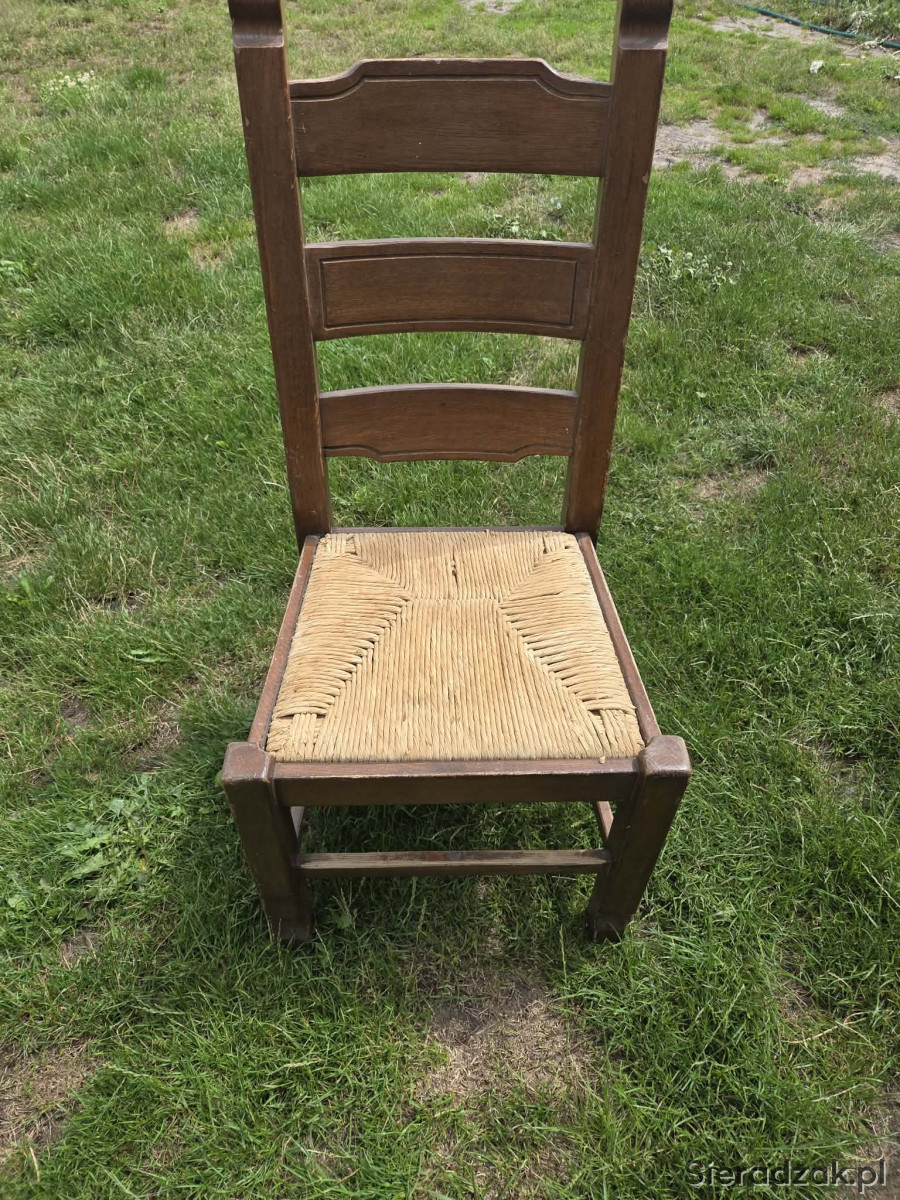 Stylowy, rustykalny drewniany fotel z plecionym siedziskiem. Posiada charakterystyczne, rzeźbione oparcie. W dobrym stanie, nadaje się do wykorzystania w ogrodzie lub na tarasie jako część wiejskiego, przytulnego wystroju.