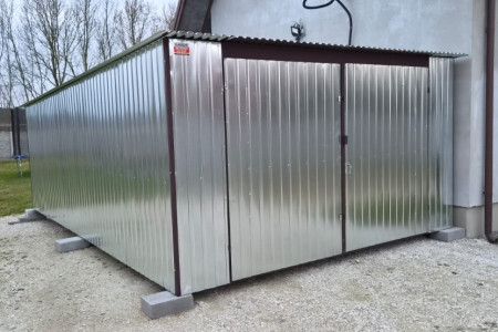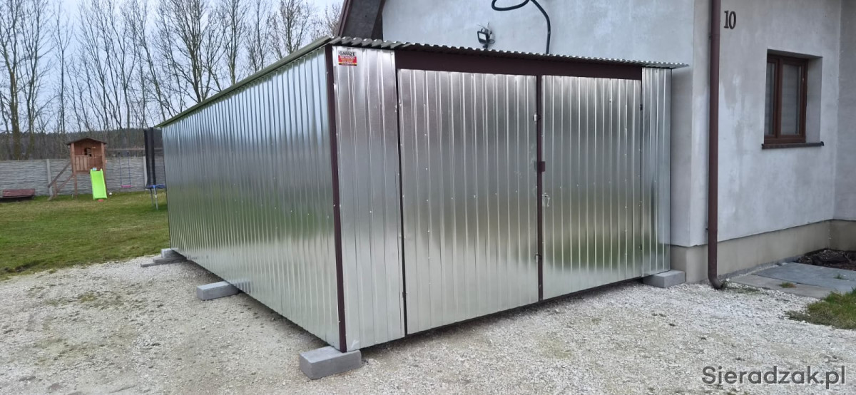 Nowy garaż blaszany o wymiarach 4x6m, do samodzielnego montażu i demontażu.