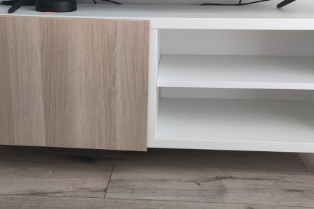 Biała szafka RTV z drzwiczkami, o wymiarach wysokość 48cm, szerokość 120cm, głębokość 40cm. Stan bardzo dobry, z niewielkimi uszkodzeniami widocznymi na zdjęciach.