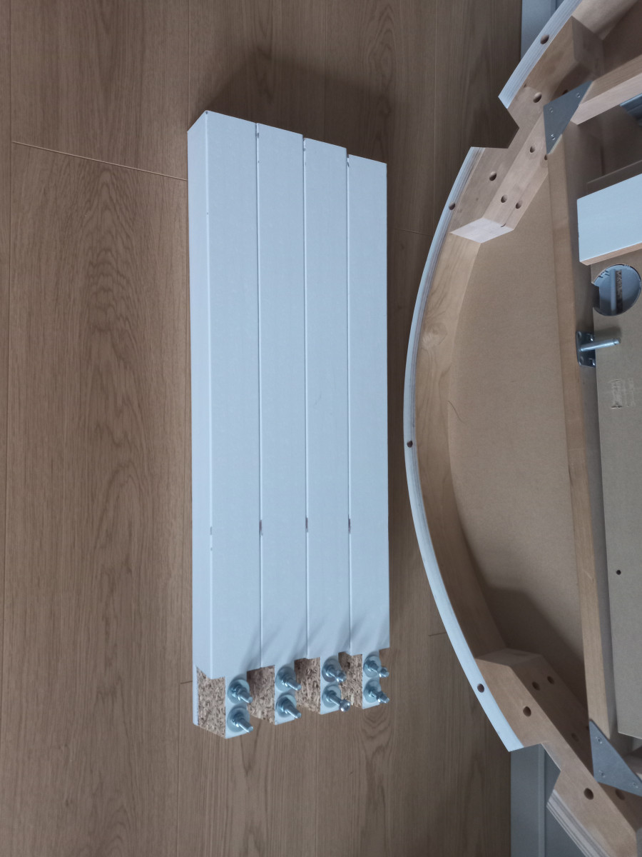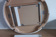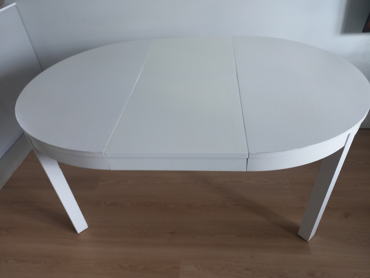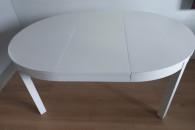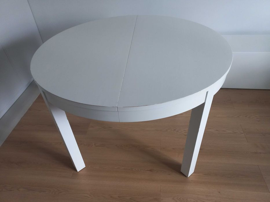 Okrągły, składany stolik Bjursta IKEA o średnicy 115 cm w kolorze białym, imitacja drewna. Wysokość 74cm, długość po rozłożeniu to 165,5cm. Stół jest solidny, stabilny i masywny. Mechanizm rozkładania jest prosty i działa płynnie, nie wymaga dużo siły. Posiada normalne ślady użytkowania oraz rysy i drobne odpryski farby. Na życzenie mogę wysłać więcej zdjęć. W razie pytań zapraszam do kontaktu.