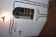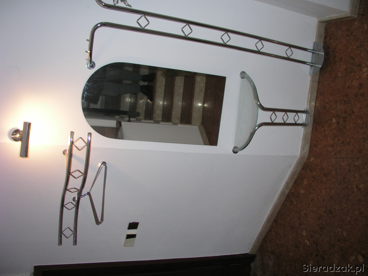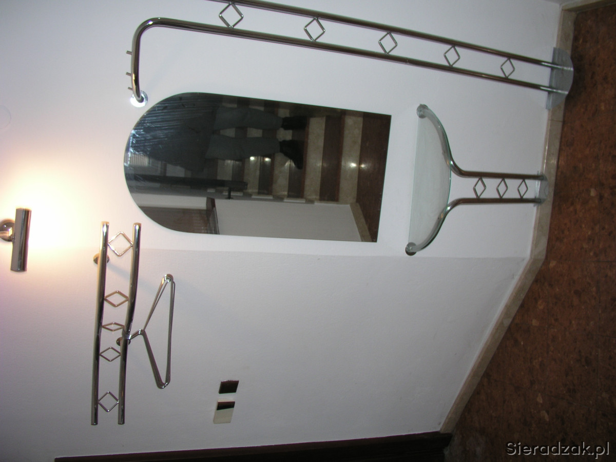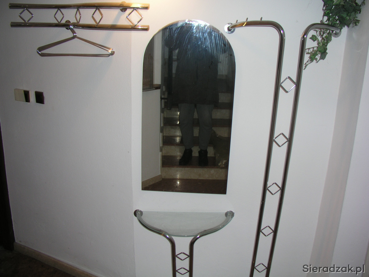 Sprzedam komplet wieszaków lustro i półkę - komplet ze stali. Lustro 100x50 cm. Półka szer 68 cm. Wieszak górny szer. 90 cm. drugi wieszaki prawo , lewo szer. 60 cm, wys. 182 cm - Sieradz