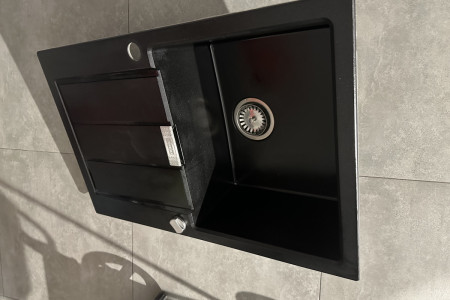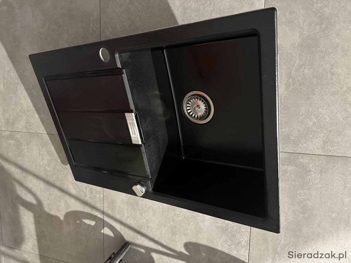 Zlew kuchenny czarny granitowy Franke z baterią w kolorze czarnym z wyciąganą wylewką
