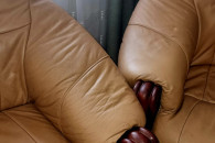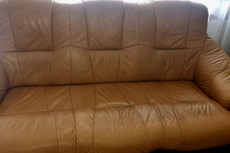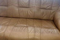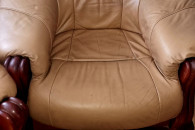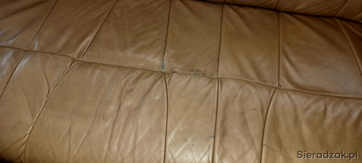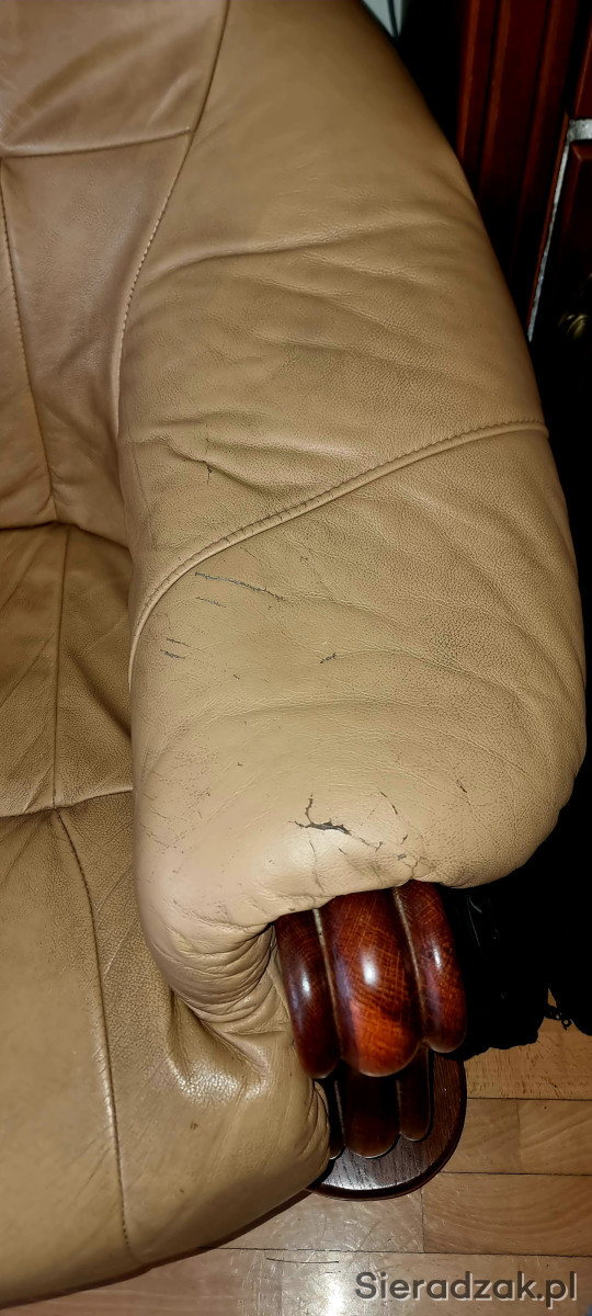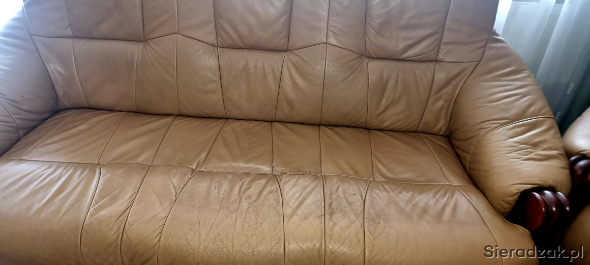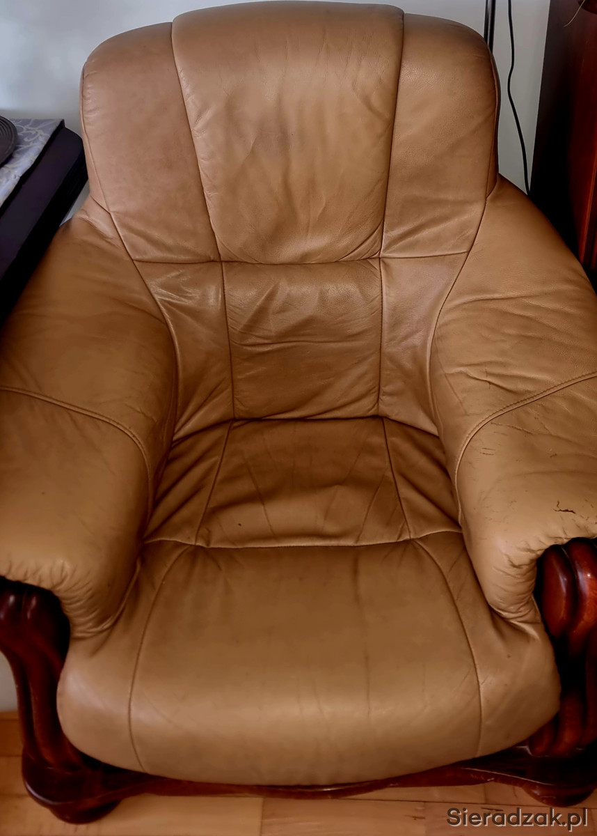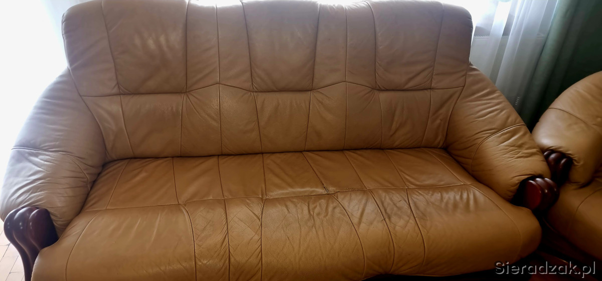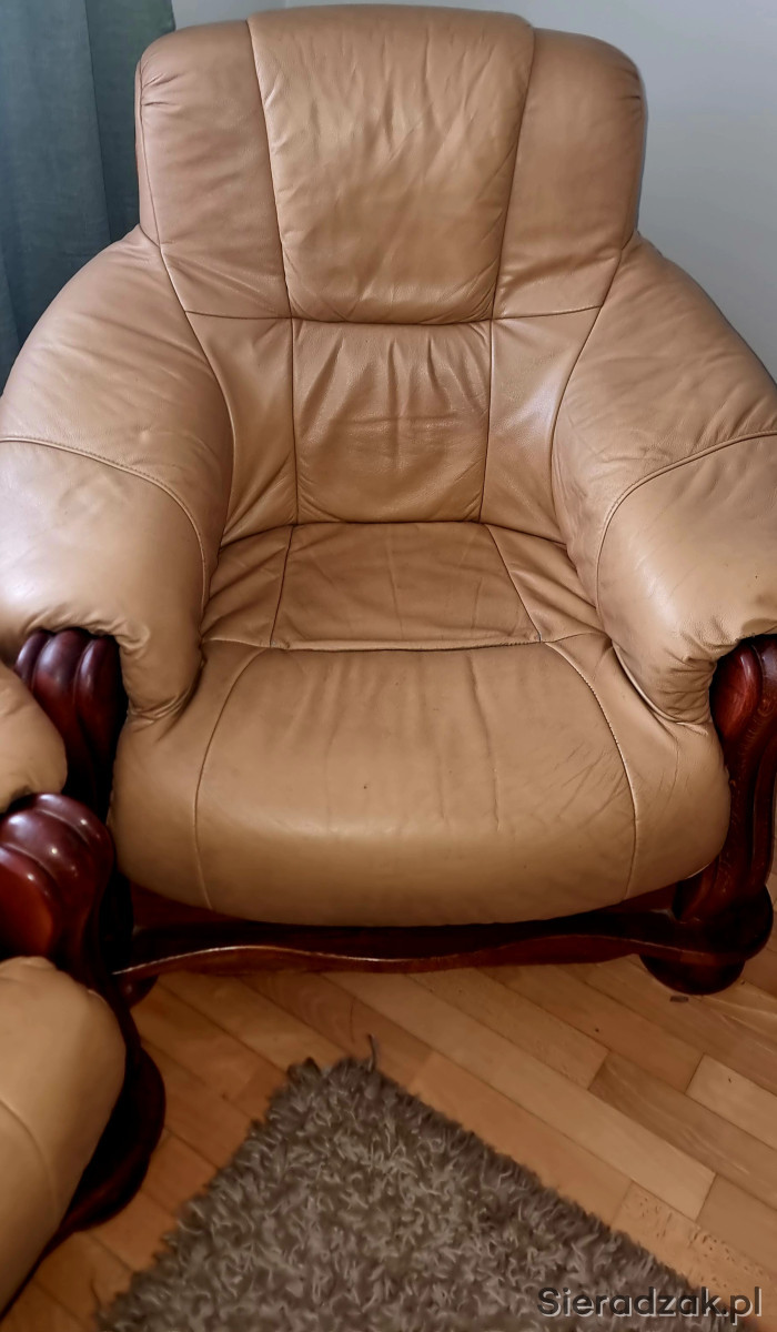 Na sprzedaż stylowy i bardzo wygodny zestaw mebli do salonu: duża sofa 3-osobowa oraz dwa komfortowe fotele jednoosobowe. Komplet wykonany jest z wysokiej jakości skóry naturalnej w ponadczasowym, beżowym kolorze, osadzony na solidnych, rzeźbionych stelażach z litego drewna.
