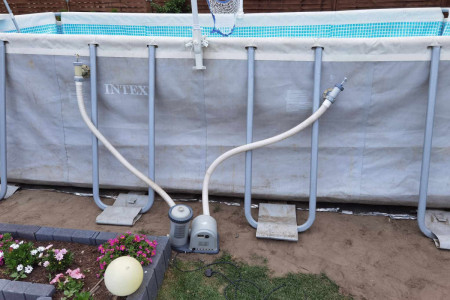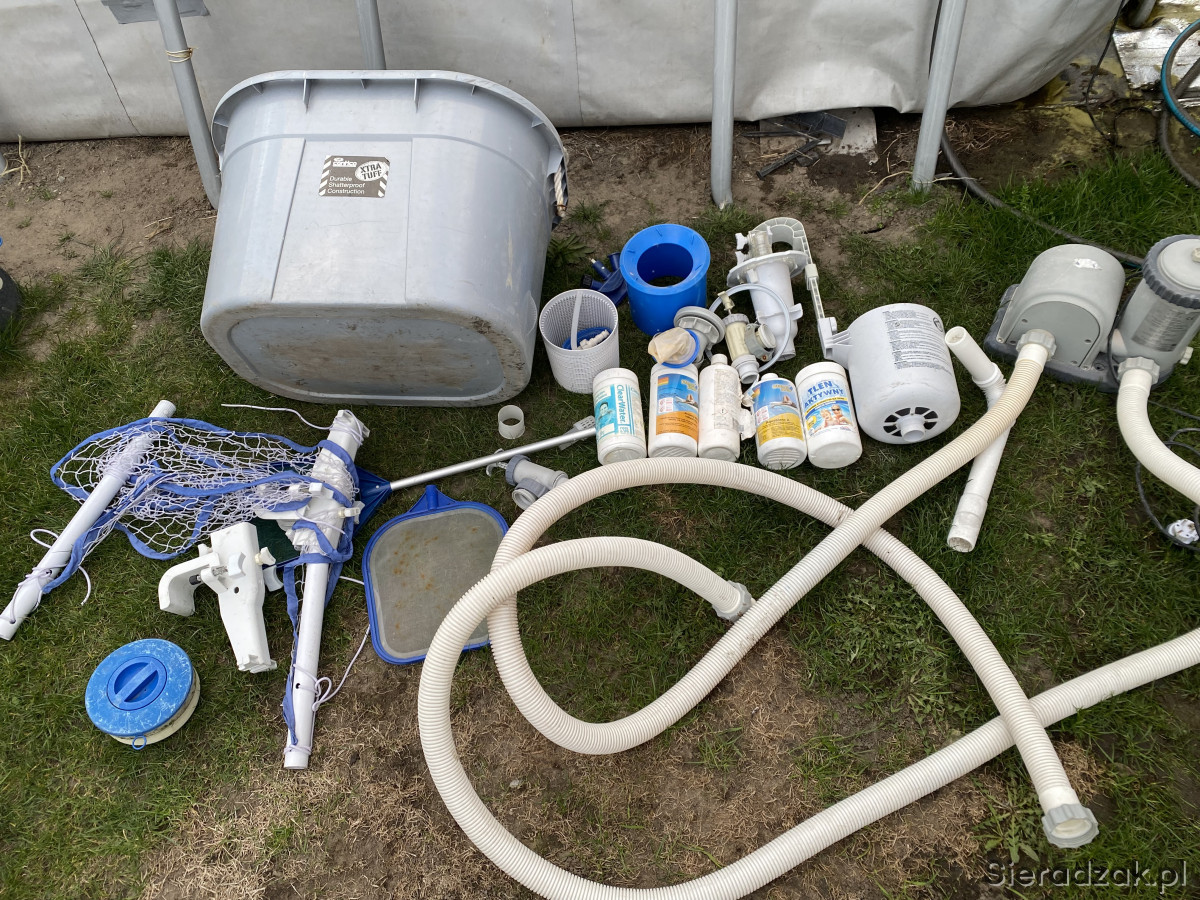 Sprzedam używany basen stelażowy Inex pojemność około 15tys litrów . Z powodu zmiany infrastruktury ogrodu muszę pozbyć się basenu. Basen nie jest idealny cena podlega negocjacji . Zestaw zawiera chemię praktycznie całą kupioną za ok 200zł oraz akcesoria basenowe widoczne na zdj wraz z pompą . Za dopłatą sprzedam nową pompę widoczna na ostatnim zdj pompa nowa kupiona w tamtym sezonie użyta raz więc jest nowa. Posiadam również panele na słońce do ogrzewania wody w basenie . Więcej informacji prriv. 691.616..983