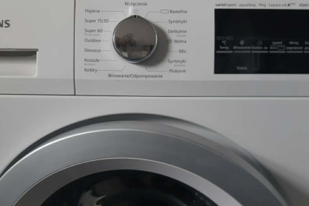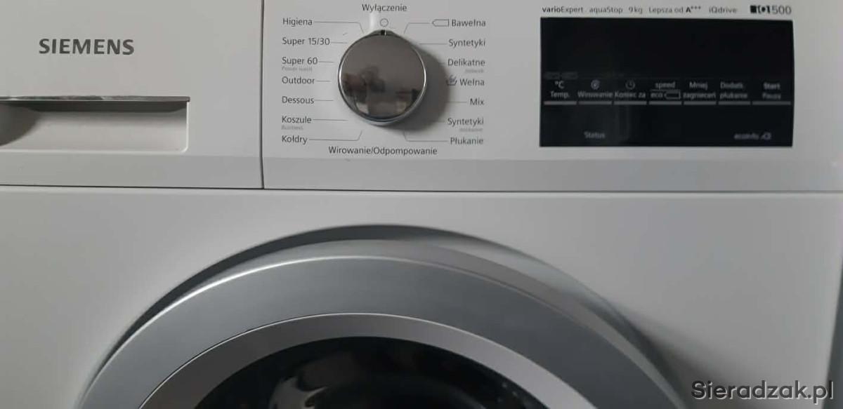 Używana pralka Siemens z gwarancją na 9 kg prania, lepsza od A+++ energooszczędna, duża prędkość wirowania, mały pobór wody; bardzo ładna, duży wyświetlacz- okazja - polecam; dowóz.