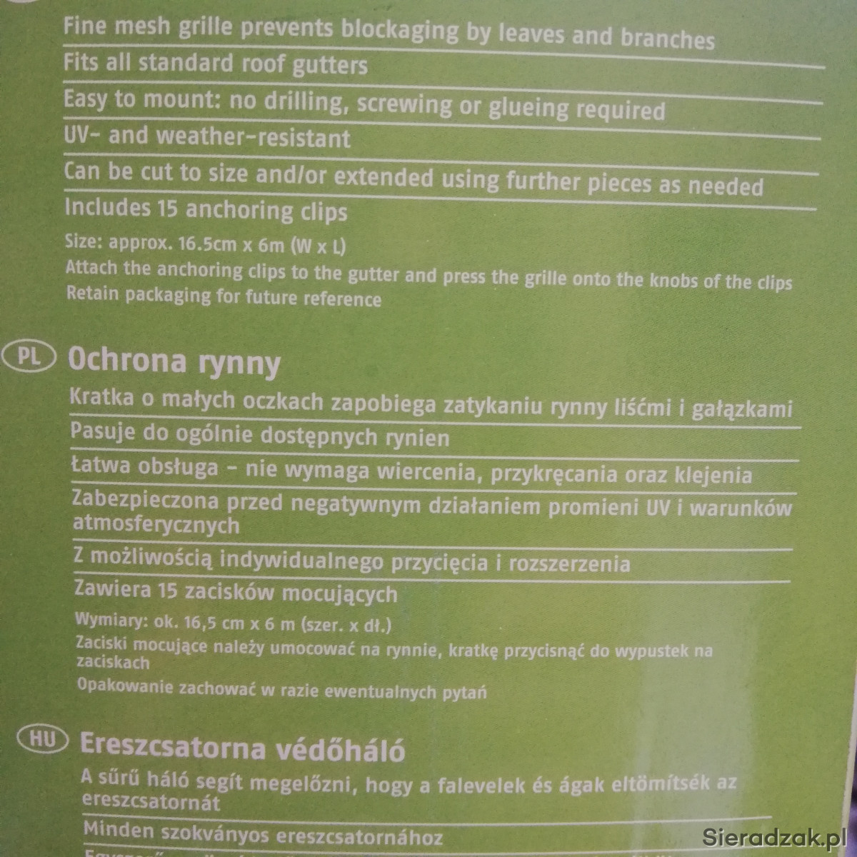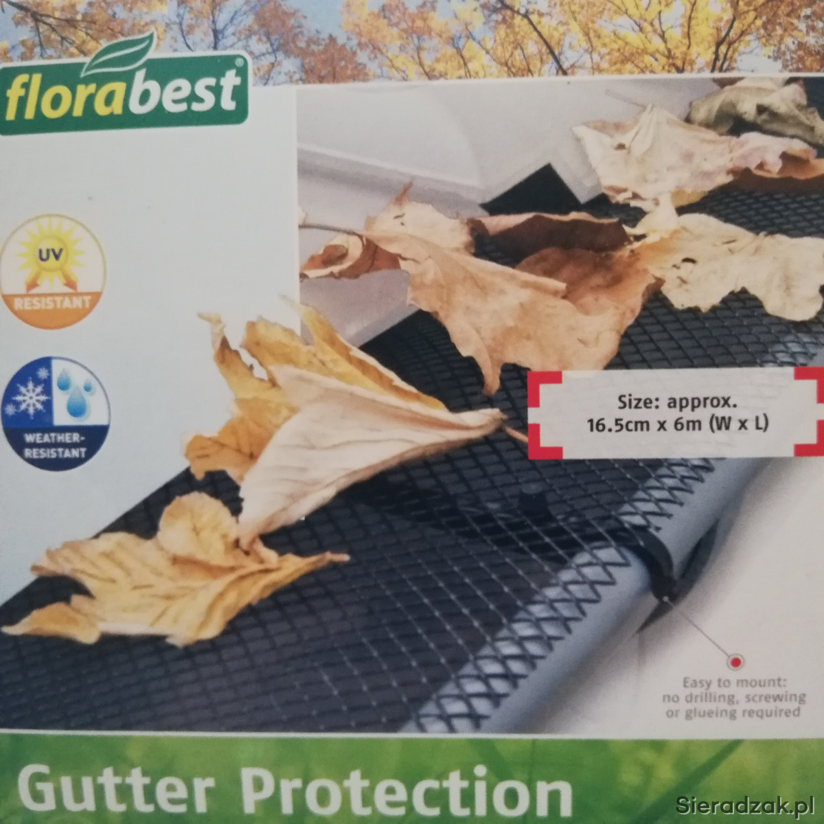 Łatwa w montażu, bez konieczności wiercenia, wkręcania lub klejenia. Idealna do zabezpieczenia rynien przed liśćmi i zanieczyszczeniami.