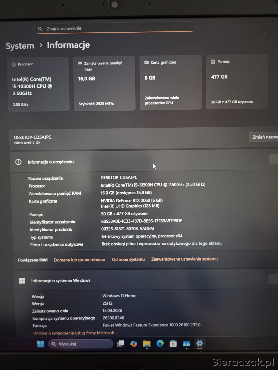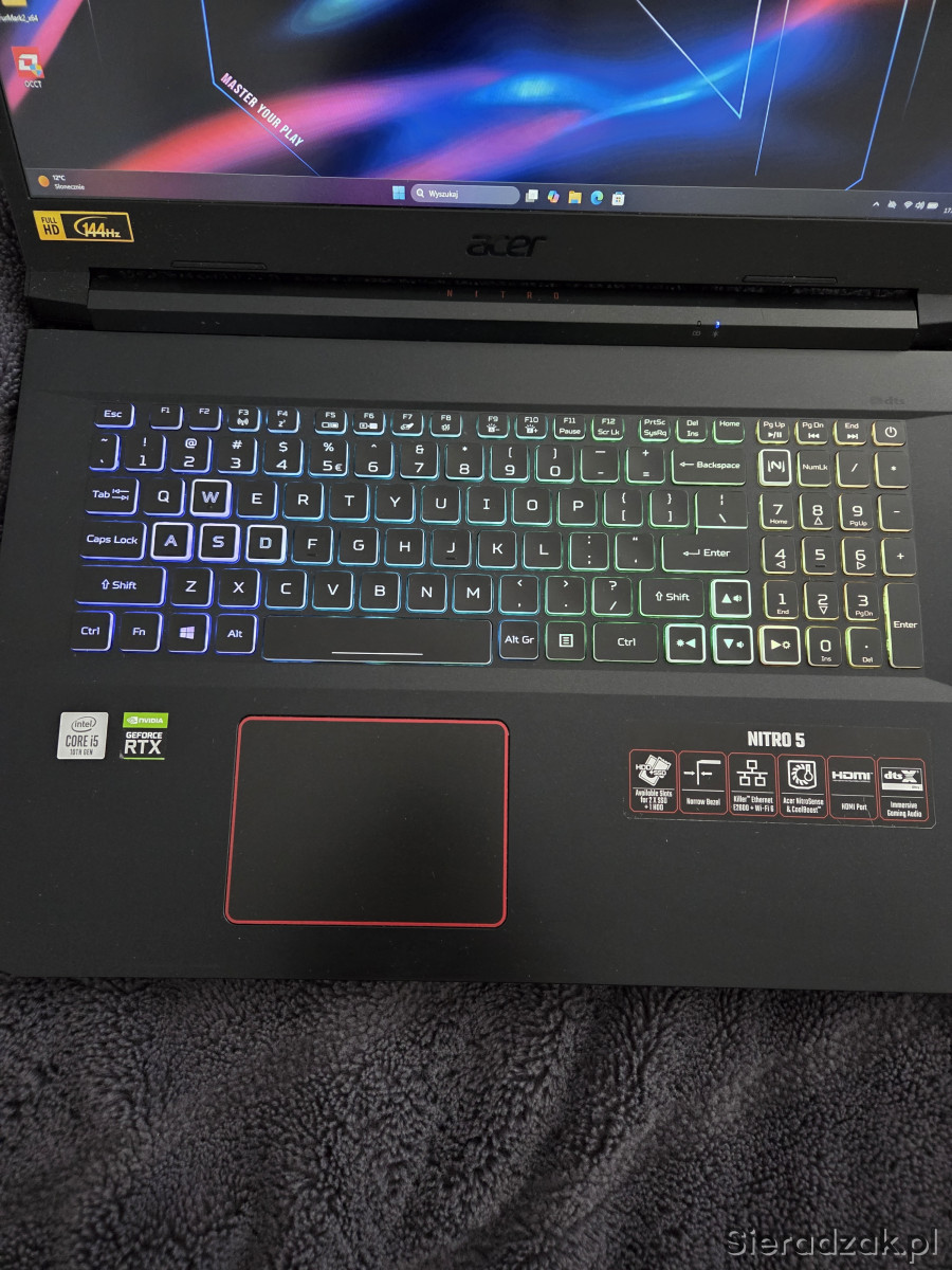 Na sprzedaż mam laptopa typowo gamingowego do gier Acer Nitro 5 ma szybki procesor Intel Core i5-10300H, grafikę NVIDIA RTX 2060 6gb vram, 16gb pamięci RAM oraz Dysk SSD 512gb nvme m2.