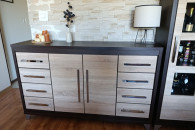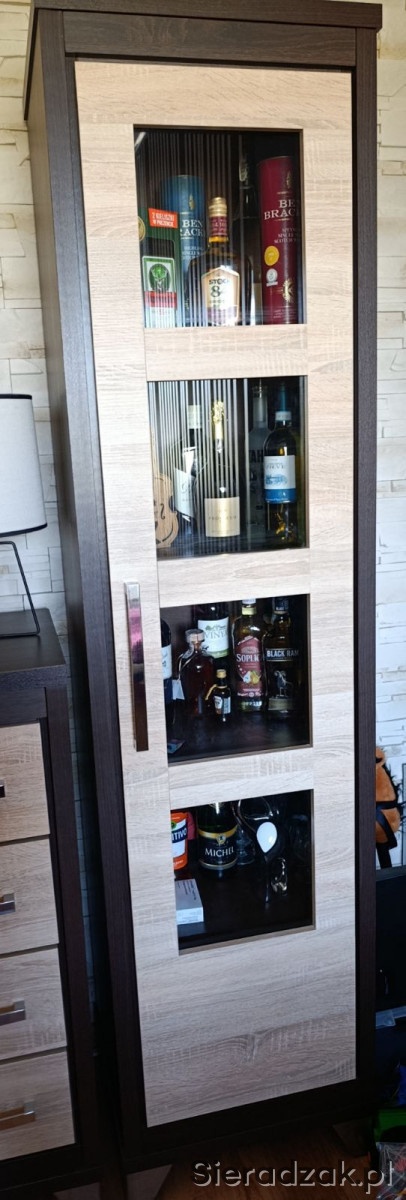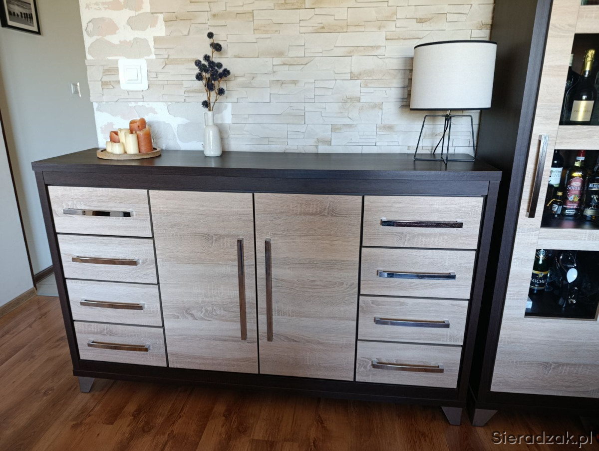 Meble posiadają normalne ślady użytkowania, nie są poobijane. Szuflady i szafki sprawne. Jedyny mankament to pęknięta jedna z szyb w witrynie ale z zewnatrz tego nie widać. Meble porządnie wykonane, ciężkie. Meble sprzedaje bez zawartości która widać na zdjęciach.