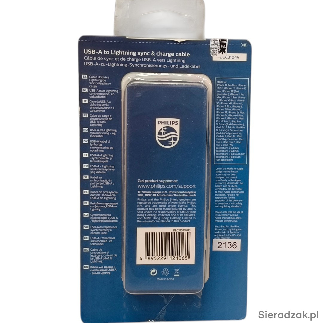 KABEL PHILIPS USB-A TO LIGHTNING 1,2M DLC3104V