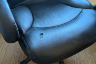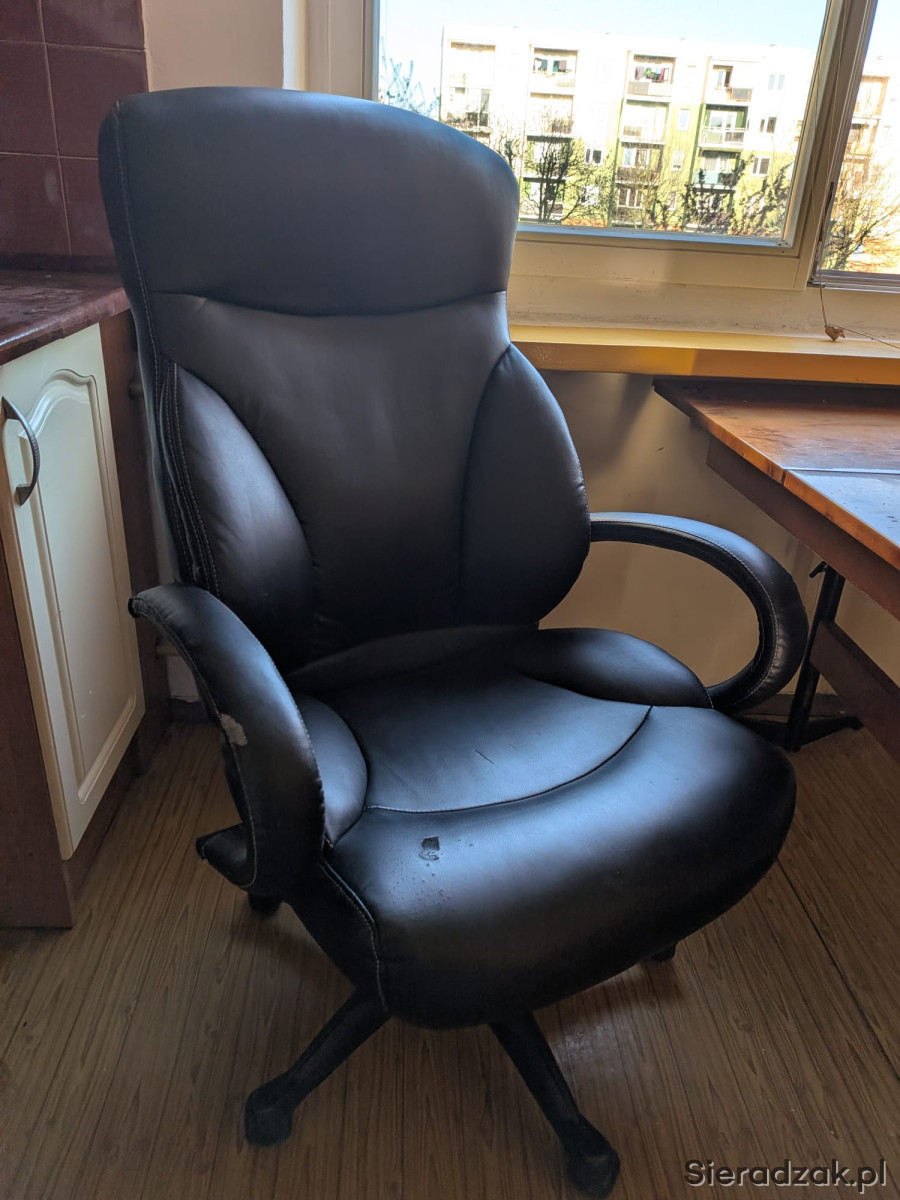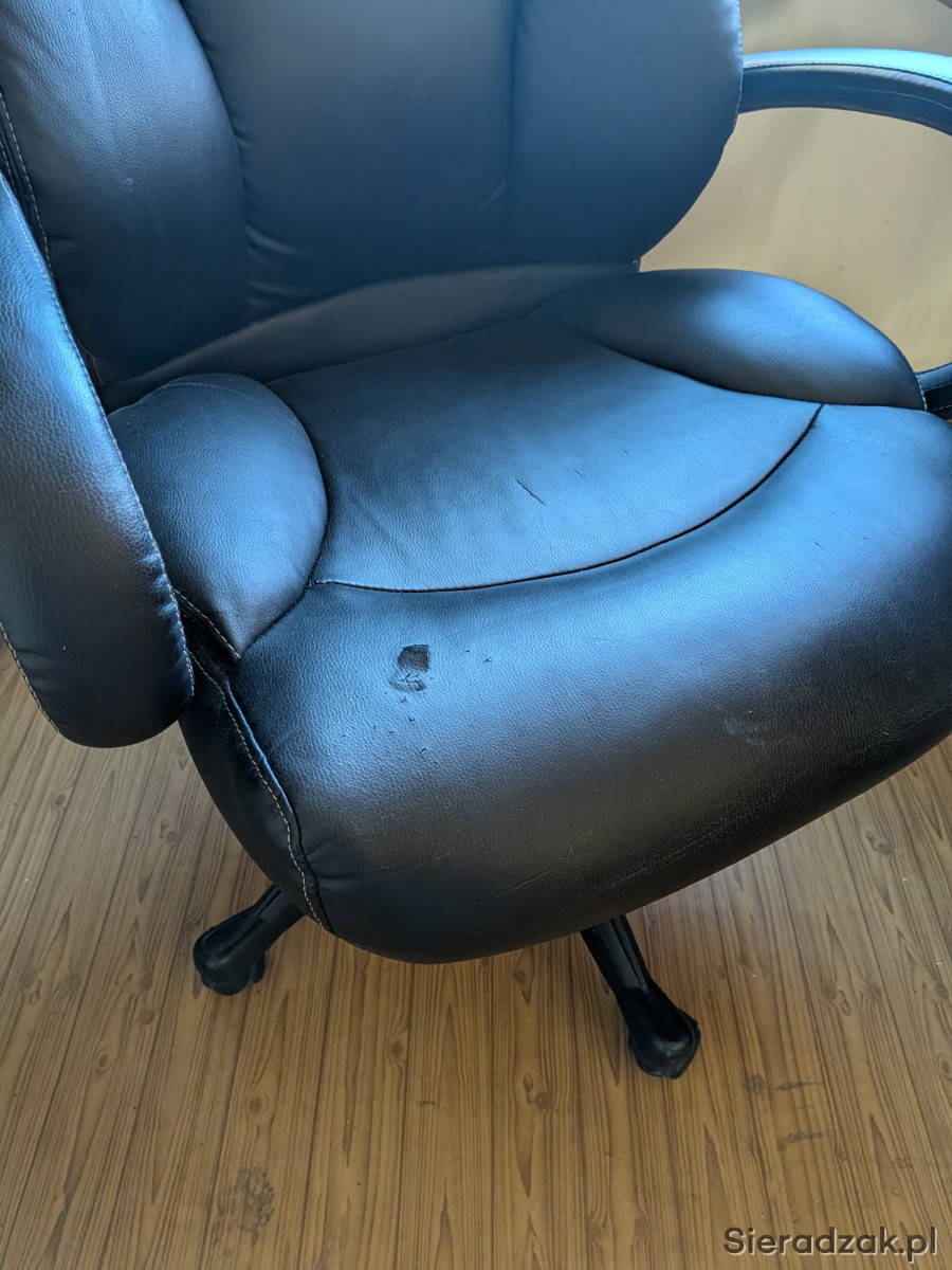 Czarny, skórzany fotel biurowy w dość dobrym stanie. Bardzo wygodny. Nieznacznie uszkodzony na siedzisku (jak na zdjęciu)